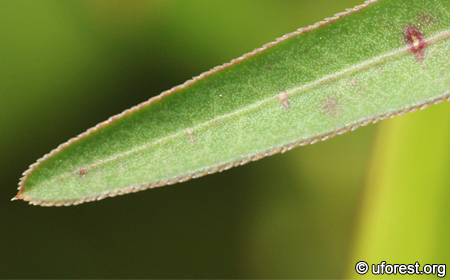 The leaf margin is finely serrated.