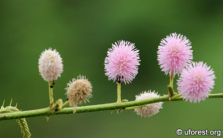 This is a short tree found only in the open scrubland, where it shares the habitat with a shurb of similar height, Leucaena leucocephala. The pink flower clusters, sensitive leaflets which close upon touch, and prickles along the bipinnate leaves makes it easily identifiable.