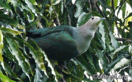 A green imperial pigeon which swallowed the fruit, seen from its swollen throat