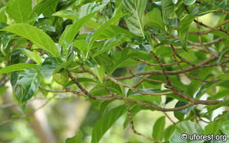Morinda citrifolia is a very common small tree cultivated for its fruits or found wild in scrublands or other open areas. The branches are straggly and untidy, and the leaves are glossy, wavy and citrus-like. It flowers and fruits very frequently, and the compound fruit is immediately diagnostic. The fruit turns from green to faint yellow when ripe.