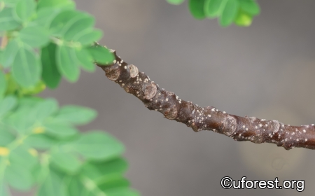 A small tree to about 10m. The leaves are tripinnately compounded, with the leaflets oppositely arranged with a terminal leaflet. Prominent leaf scars can be seen on the ends of the branches. The flowers are white or cream coloured. The fruits are long pods, giving its other common name of Drumstick Tree.
