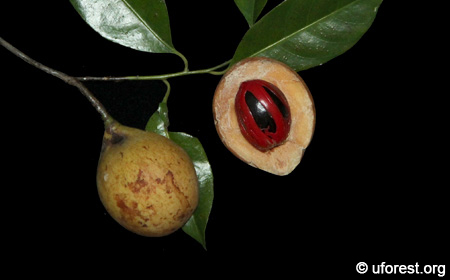 The fleshly fruit wall of the is the commercial nutmeg sold as a sweetmeat (Rao, 1989). The red aril which envelops the seed is known as the mace and the black seed, also known as the nutmeg are both used as a spice.