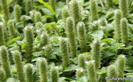 The erect inflorescence of Nelsonia canescens makes this wild flower easily noticeable. The leaves have uneven margins and are oppositely arranged. The entire plant is covered with off-white hairs.