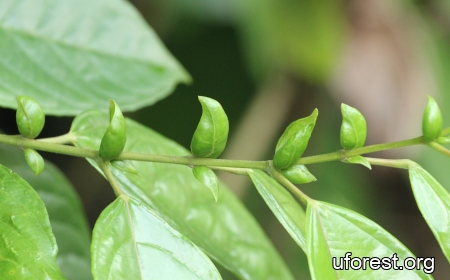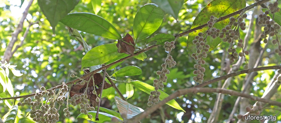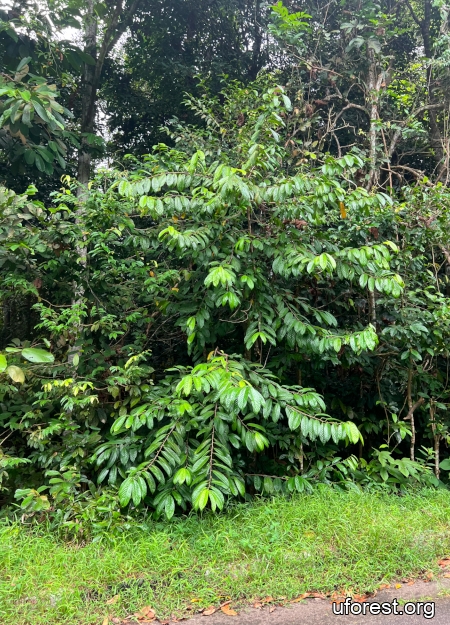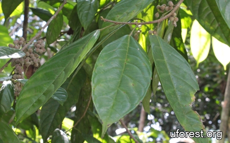 A tree that can grow up to 30m, Osmelia grandistipulata possesses large, distinct stipules that can be found near the ends of young branches. The young leaves are also mildly serrated near the ends of the leaves. The fruit dehisced to reveal a fleshy orange aril.