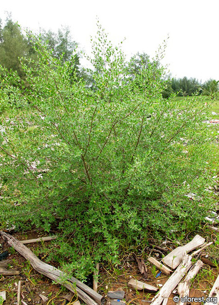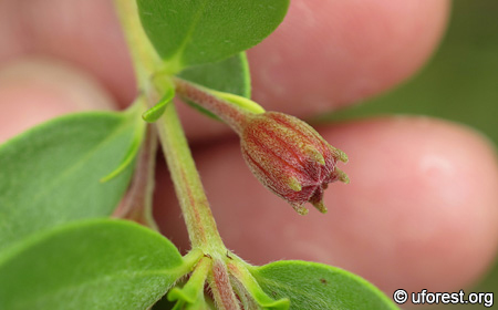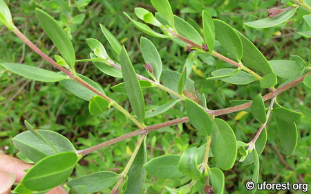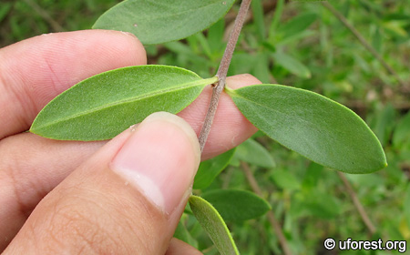 Pemphia acidula is a very rare plant found in coastal or rocky shores. The leaves are oppositely arranged and elliptic in shape. The secondary veins are hardly noticable. Both the leaves and young branches are densely covered with fine white hairs, thus having a smooth texture.