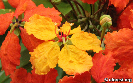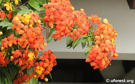Bauhinia kockiana is a climber commonly cultivated over trellises and shelters. It has tri-veined opposite leaves and are often flushed with attractive orange inflorescences that gradually turn to yellow with age.