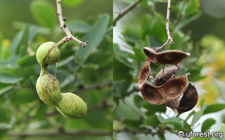 The unripe fruit pod (left) and one which have splited (right).