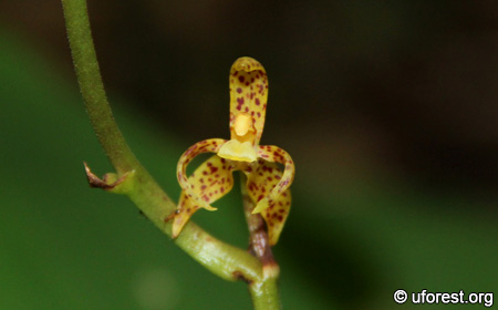 Plocoglottis javanica is a herbaeous orchid with single leaves extending from the ground. The leaves are elliptic with parallel veins, attached to slender pseudobulbs about 10cm long and 1cm thick. The inflorescence are borne on a long stalk extended. It bears numerous yellow flowers which are painted with scattered red dots. The side petals are thin and curved.