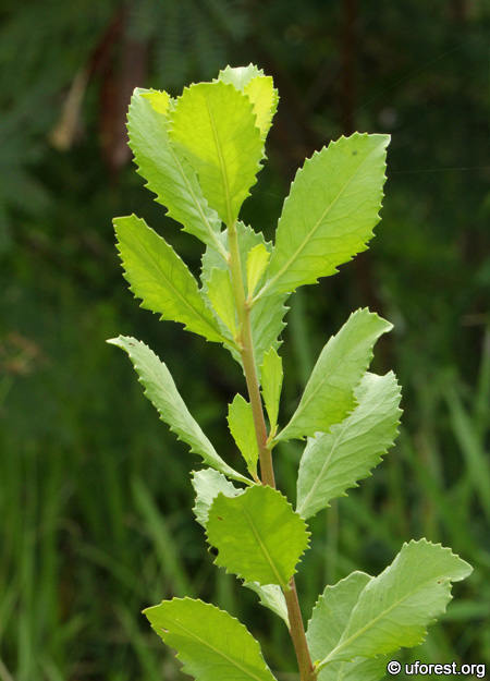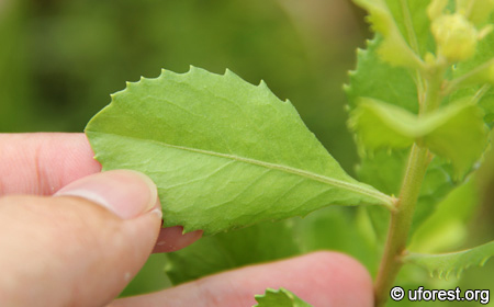 Serrated, thick, and hairless leaves.
