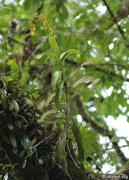 Pomatocalpa diffusum is a single-stem epiphytic orchid that can grow up to 5m long (Watthana, 2007). Roots can emerge throughout the length of the stem. The leaves are long and narrow (up to 20 x 4 cm). The inflorescences are branched with tiny yellow flowers. The petals are lined with reddish-brown edges.