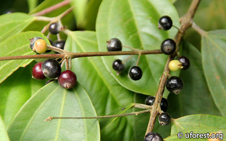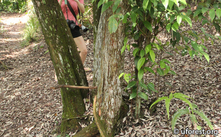 Rhodamnia cinerea is a very common tree in our secondary forests, growing up to 20m. It is most easily distinguished from its oppositely arranged leaves, which are tri-veined, and have a silvery underside.