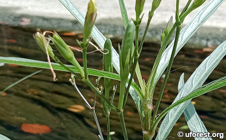 Ruellia simplex is a erect herb up to 1m tall, and prefers moist wet habitats. It has very distinct linear leaves, squarish stems, and pink to purple flowers, depending on the cultivar.