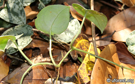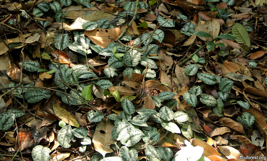 The Satin Pothos sprawling over the forest floor in Bukit Timah Nature Reserve.