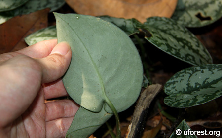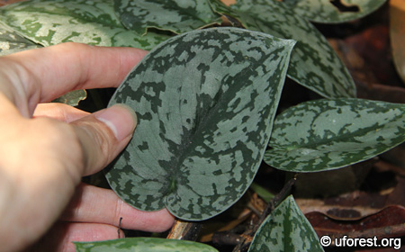 Scindapsus pictus can be commonly found creeping on forest floors of Bukit Timah and Central Catchment Nature Reserves. The leaves are distinct from the varigated colour. The younger leaves are heart-shaped and slightly sickled, while the adult ones (which I have yet to see) are more elongated (Keng et al., 1998). A silvery sheen can be seen when tilted at an angle under light.