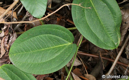Smilax setosa is a herbaceous climber, with large and alternately arranged leaves. The leaves are also large (~25cm long) and broad with a cordate base, and 3-7 main veins. The stem is covered with brown or white hairs, together with some back-pointing spines. Tendrils extend from the leaf stalk to enable their quick colonisation of their host trees.