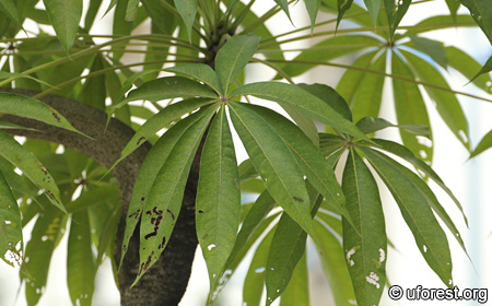 Sterculia foetida is a common cultivated tree with pagoda-like branching. The leaves are palmately compound and have long petioles. It resembles Ceiba pentandra in its form and leaves.