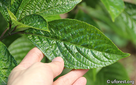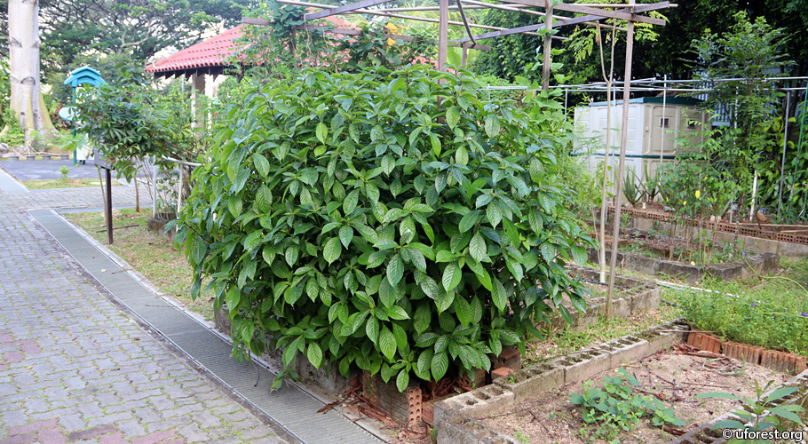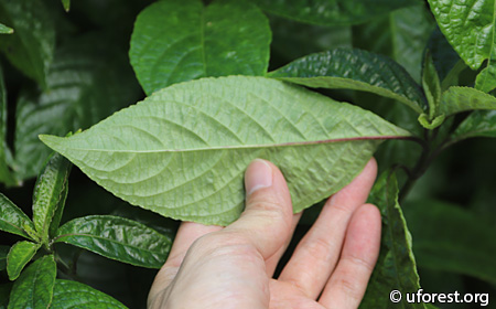 A small shrub very commonly grown privately for medicinal use. The opposite leaves are very distinctive, with crenate margins, and rough in texture. The upper surface is dark green, glossy and deeply depressed secondary and tertiary veins. The stem, petiole and primary veins on the underside of the leaves are sometimes purplish.
