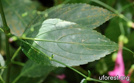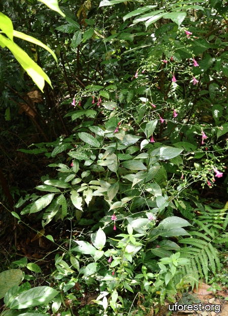 A short erect herb of less than 2m. The leaves are ovate or elliptic, with serrated margins and raised veins. The inflorescence is a panicle, and the individual pink flowers are trumpet-shaped.