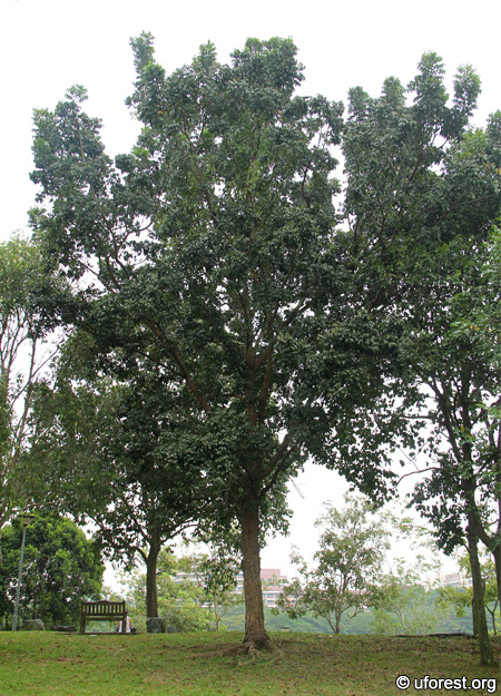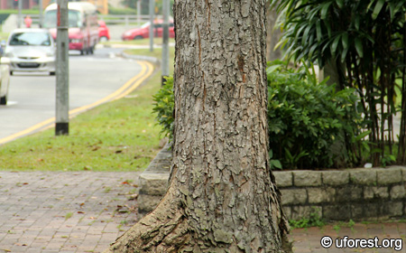 This is one of our earliest cultivated trees; being introduced to Malaya (where Singapore formerly belongs to) in 1876 (Corner, 1988). Many huge mature stands still guard the streetscapes at many places, and it is the 3rd most commonly cultivated tree by NParks with 20,849 individuals (Tan et al., 2009). The scaly, crusted bark is easy to recognise together with its sickled-shaped leaflets. While the flowers are very small and inconspicious, the fruits are large and brown. When dried, the capsules split into five parts and release numerous single-winged seeds which spin.