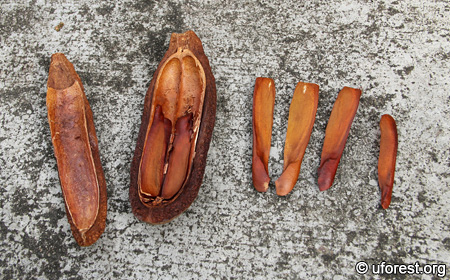 The capsules split (left) to release single-winged fruits (right).