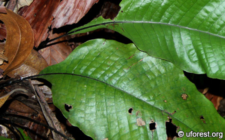 Tectaria singaporiana is a common fern in the Bukit Timah and Central Catchment Nature Reserves. At the former, it is especially abundant along slopes adjacent to the main trails.The form consists of just a tuft of fronds from a point. The fronds have distinct and depressed secondary and tertiary veins, the latter running perpendicular to the former. The stalk is thin and black.