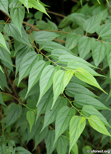 A branch, showing the leaves' long drip tips and alternative arrangement.