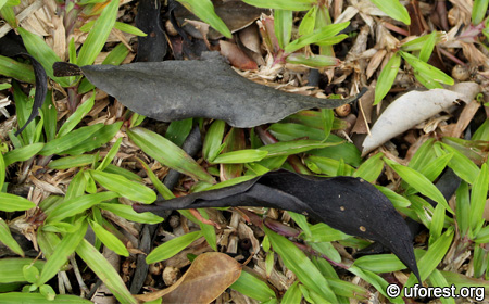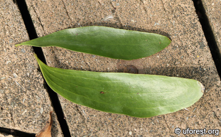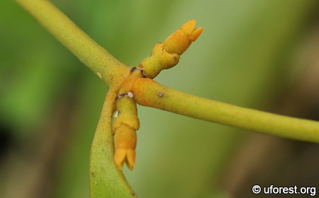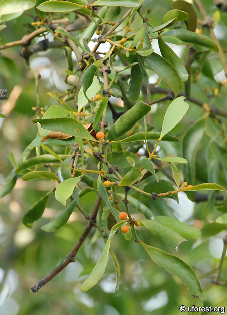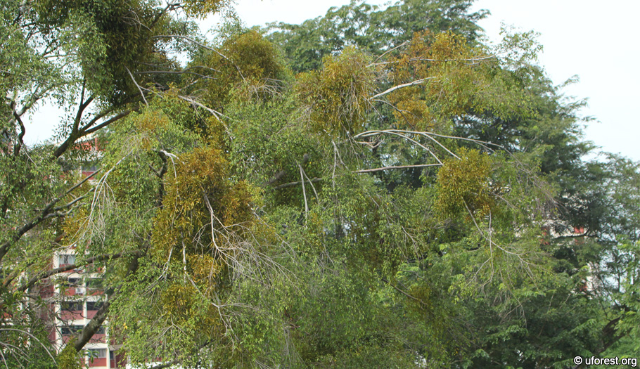 One must first learn how to spot a mistletoe, which is obvious when a tree's foliage contains two distinctively different type of leaves; meaning that the one of them could be the parasitic mistletoe. Viscum ovalifolium can be easily differentiated from other mistletoes since it is the only species in Singapore with elongated leaves marked with parallel venation. Note that the leaves are also oppositely arranged.While the leaves and stems are sometimes green, there are many instances when I have seen the leaves in yellow with the stems light brown to orange. This makes it very easy to spot from a distance. The fallen leaves which turn black after drying can be a useful guide