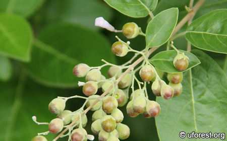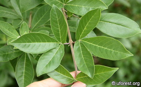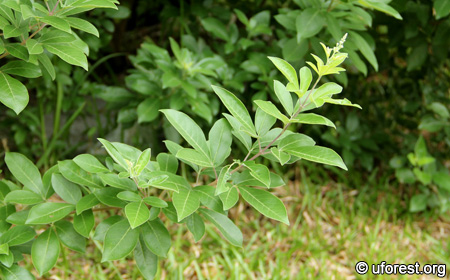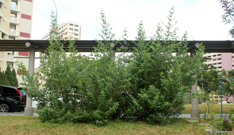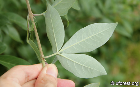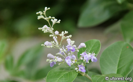Vitex trifolia is a shrub commonly seen cultivated in gardens and occasionally growing wild. It can be identified from its trifoliate leaves, with their leaflets sessile (except for the mid leaflet which has a hardly noticeable stalk). The colour of the leaves ais smokey green on top, and white underneath.