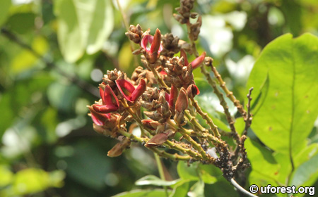 Callerya eriantha is a woody climber, found in our nature reserves. It has compound leaves that are opposite pinnate of 2-3 pairs, with a terminal leaflet. Each leaflet have a distinct drip-tip. The coppery red flowers are covered with golden hairs. The fruit pods are 1-seeded.