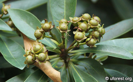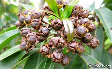 Riped fruits as brown capsules that splits into four halves.